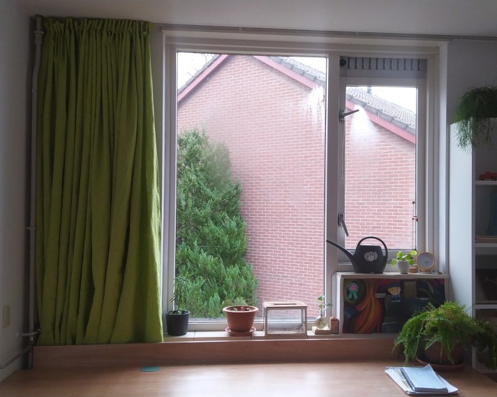 Voor onze werk/studeerkamer maakte ik appelgroene gordijnen van linnen π