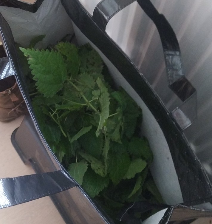 Het begon met dat ik verder wilde experimenteren met het maken van zeep. Ik had nu een basiszeep gemaakt, een mislukking, een rebatch, en nu wilde ik weer terug naar gewoon maken. Nu was het november dat ik deze zeep maakte. Het was herfst en ik kon nog net brandnetels plukken. Dus ik ging met mijn dochter het bos in voor schatten. En we kwamen na een heerlijke wandeling terug met verse brandnetels en takjes met naalden voor dennenzeep. We waren toch in het bos, konden we net zo goed meteen ook op zoek naar dennennaalden en de juiste boom.