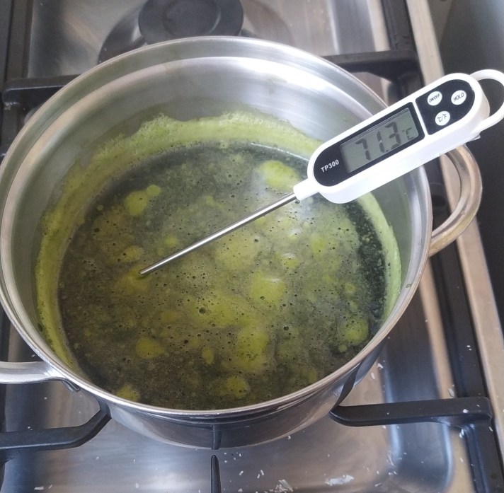 Het maken van deze zeep ging eigenlijk heel goed. Dat was fijn. Ik merkte dat ik sommige zeephandelingen al goed onder de knie had, en daardoor kostte alles minder denk en werktijd. In principe smolt ik weer de oliën. En voegde ik aan mijn loogoplossing het verse brandnetelextract toe.