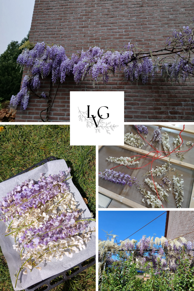 Wat ik typte over dat verse bloemen gebruiken niet werkt; daar kom ik op terug. Afgelopen week heb ik geëxperimenteerd met een vers-bloemen maceraat maken, evenals één van gedroogde bloemen. Beide van de Wisteria. Ik vond ergens op internet dat je als je een vers bloemen maceraat maakt je het eigenlijk maar 10 dagen mag laten staan. Daarna moet je het zeven en kun je er eventueel nieuwe verse bloemen aan toevoegen. Die je dan ook weer 10 dagen laat staan om vervolgens weer te zeven.