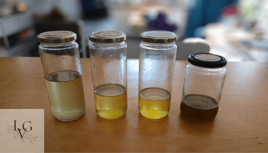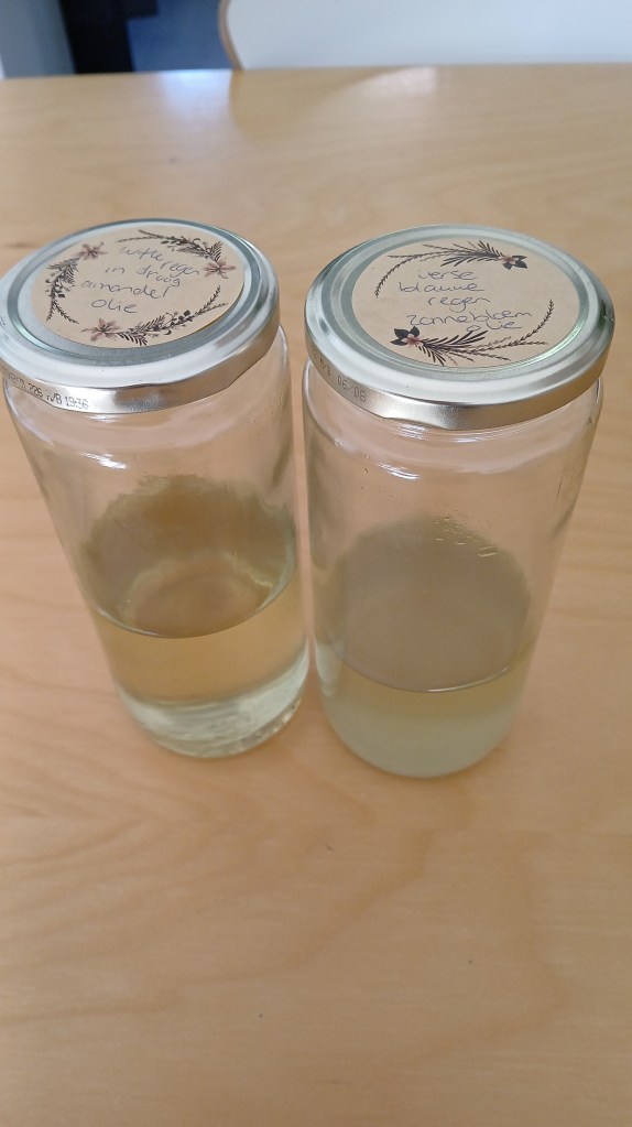 Van links naar rechts: gezeefde wisteria in zonnebloemolie, dan mengsel van hop en wisteria in amandelolie, dan alleen hop in zonnebloemolie en helemaal rechts lavendel in olijfolie. Leuk om de verschillen te zien en de kleuren en geuren die het oplevert. Ze zijn echt alle vier verschillend. De geur moet zich nog wel verder ontwikkelen. Het ruikt nu allemaal een beetje weeig. Maar wie weet wat er gebeurd als je het nu zes weken laat staan..