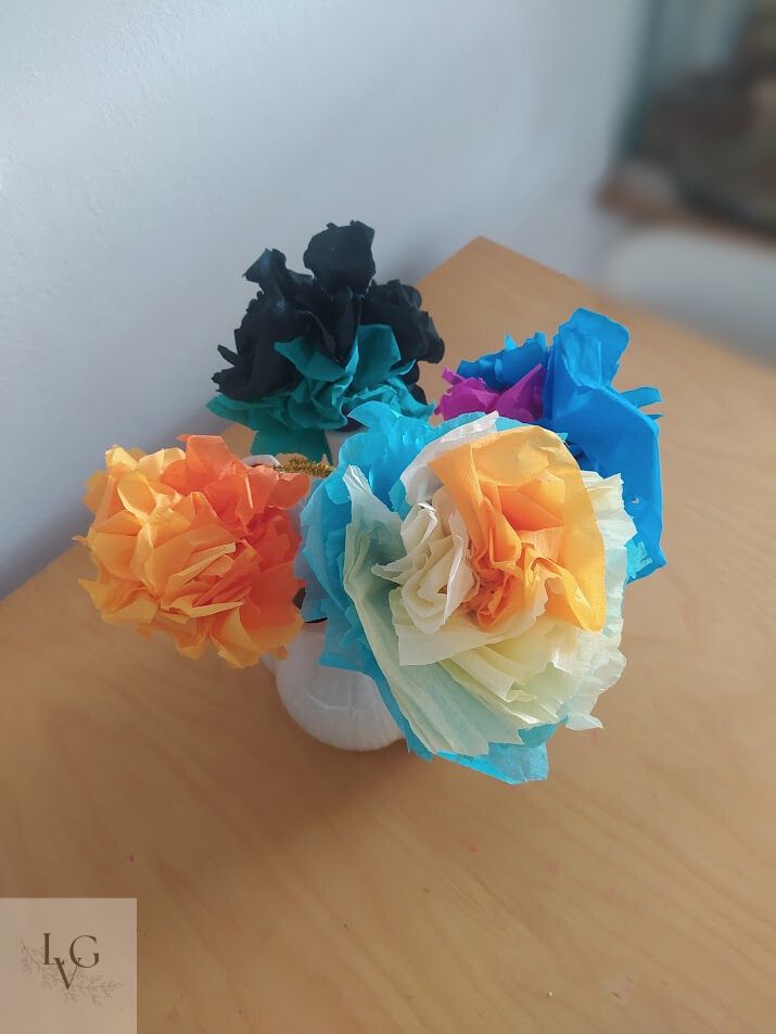 Het idee kwam van youtube. Zoek dan op: bloemen maken van crêpepapier. Er is een heleboel keuze!
