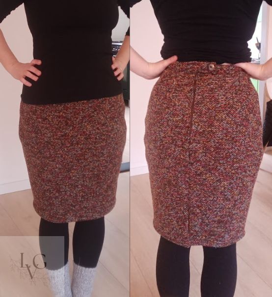 Voor mezelf maakte ik een kokerrok van een gebreide stof die ik op de markt vond. Met blinde rits, overslag, knoop en voering
