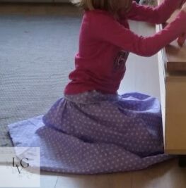 Keet zocht zelf de stof en het patroon uit. Ik paste het patroon aan op haar wensen. Omdat ik de rok graag zwierig wilde hebben maakte ik van een gewone lange rok een strokenrok. Alles gerimpeld. Veel werk! Maar: heel kind-vrouwelijk π en authentiek π