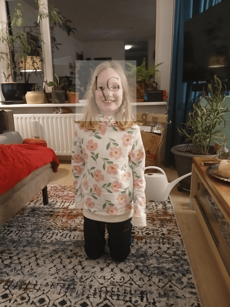 Op de naaipagina van 2023 zie je de blauwe feestrok, van keperkatoen. Ik vond hem te stijf en te chique om naar school aan te doen. Dus wilde ik een tweede maken die ze wel naar school aan kon doen.