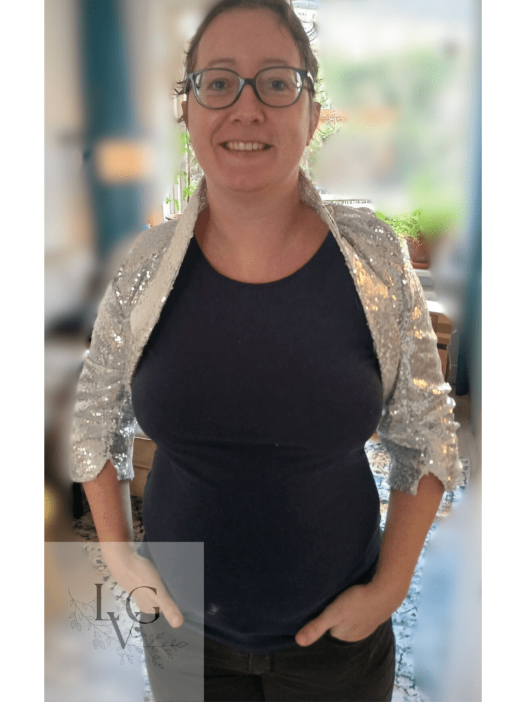 En toen wilde ik een bolero maken van een glitterstof met voering. Wat heb ik lopen mopperen tijdens het maken. Lol. Uiteindelijk best gelukt. Maar niet helemaal hoe ik het wilde. Nou ja, imperfectie omhelzen dus, want zo vreselijk is hij nou ook weer niet, grijns.