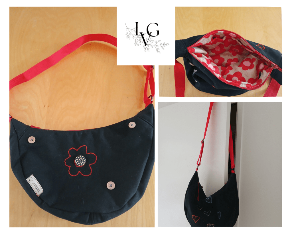 Zwarte canvas met machine geborduurde afbeeldingen aan de buitenkant, een zachte bloemige stof aan de binnenkant. Een rits en twee vakken aan de binnenkant en een stevige rode rits als sluitwerk. Verder; rode tassenband en donkere D-ringen voor de band.