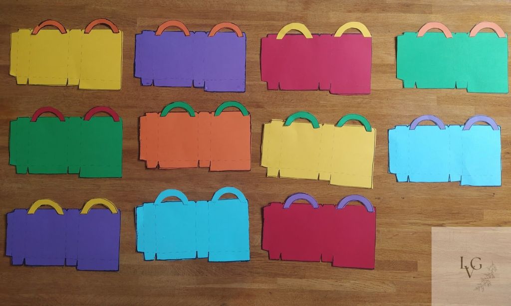 En nam ze over op gekleurd papier. Samen knipten Keet en ik ze uit. De greepjes knipten we apart uit en zetten we er later op.